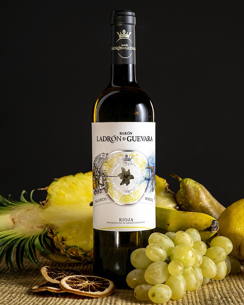 Ladron de Guevara Branco Seco – De uvas Malvasía e Viura. A Malvasía é uma variedade minoritária e escassa em Rioja. Típico de climas secos, solos pobres e alta sensibilidade à umidade. Cachos de tamanho médio e formato esférico, que quando maduros apresentam coloração avermelhada. Elabora de vinhedos com mais de 35 anos.